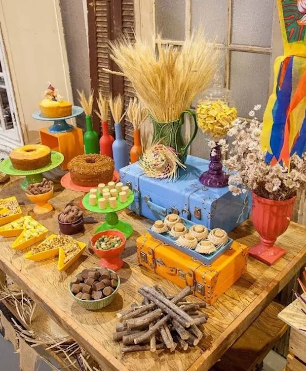 Para quem quer uma mesa mais elaborada, aposte nas louças coloridas, garrafas pintadas, palhas, galhos de árvore e flores secas. Bolos simples e doces juninos completam o conjunto do arraial em casa.