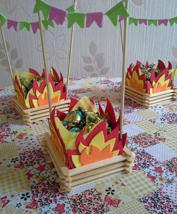 Festa junina tem que ter fogueira! Dá para fazer em casa usando palitos de sorvete e EVA cortado (ou papel crepom). Use as cestinhas para colocar doces enfeitar a mesa.
