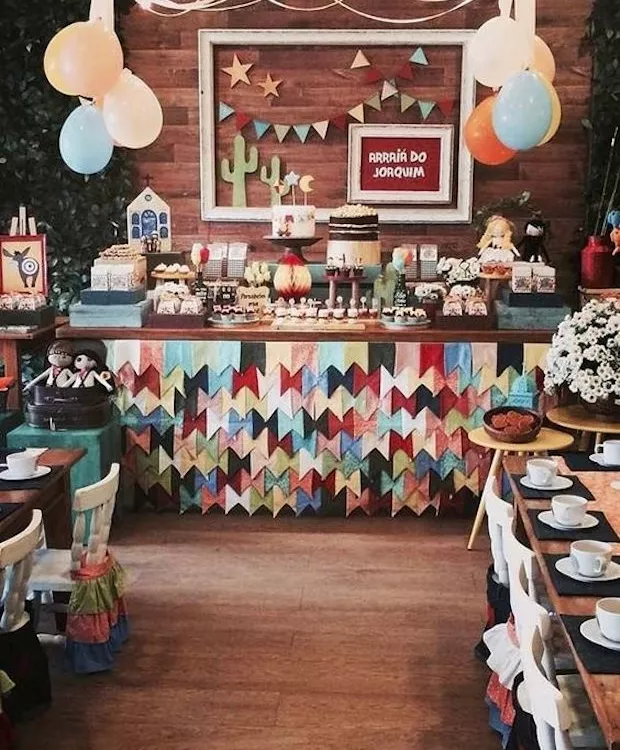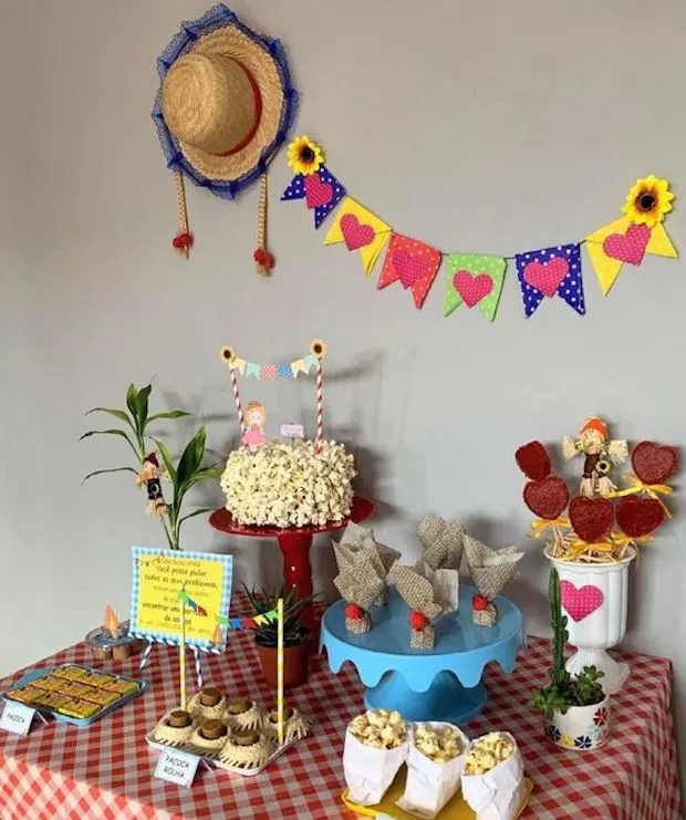 Festa Junina e aniversário de criança é uma ótima combinação. Bandeirolas e mesa temática comemoram a festa infantil e já fazem junto um arraiá para a família!
