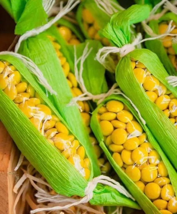 Essa é uma ideia super simples: basta colocar confetes amarelos em sacos de plástico, envolver em papel crepom verde e fechar tudo com uma fita. Temos aí “mini milhos” de doce!