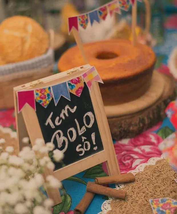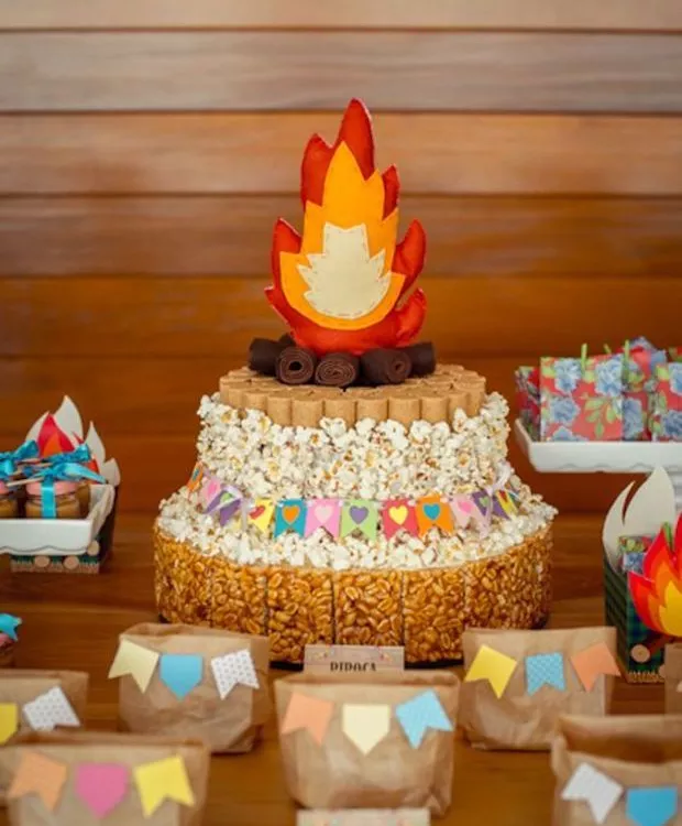 O bolo temático pode levar pipocas, paçocas e pés de moleque como cobertura decorativa. Uma fogueira feita de tecido ou de papel pode enfeitar o topo e incrementar o tema.