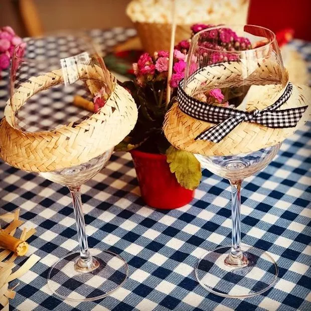 Ideias simples para uma mesa de arraiá: taça com chapéu de palha cortado e toalha xadrez (Foto: Giselle Rosa / Pinterest)