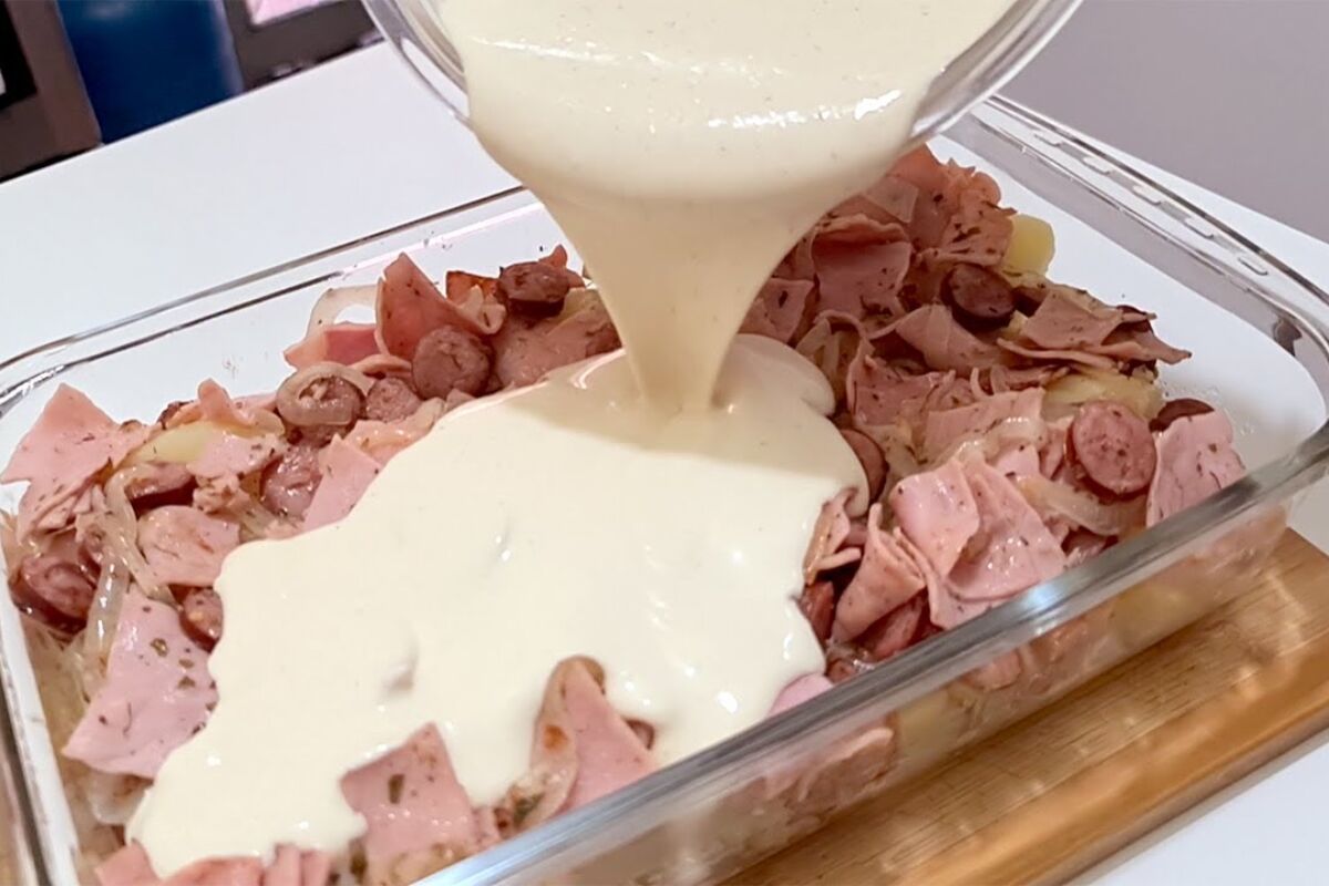 - Num refratário untado com azeite, coloque as batatas cozidas e cortadas em cubos, despeje o refogado de linguiça, a mussarela ralada e o salame fatiado.