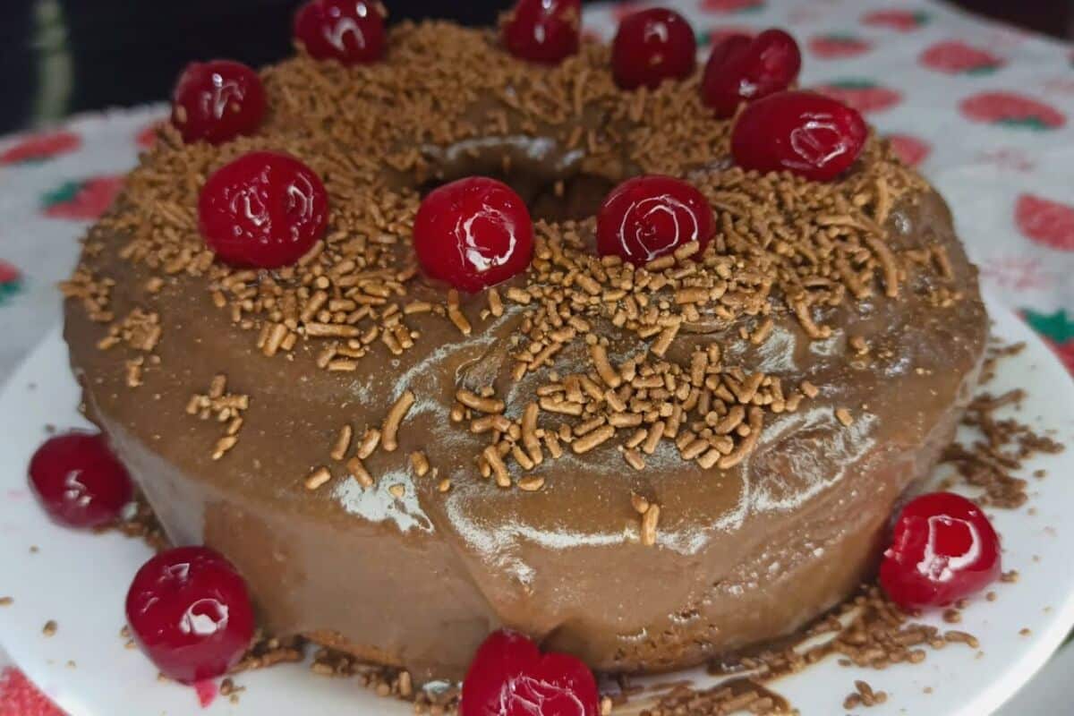 - Despeje sobre o bolo, espalhe bem para cobrir toda a superfície, polvilhe granulado de chocolate e decore com cerejas em calda.