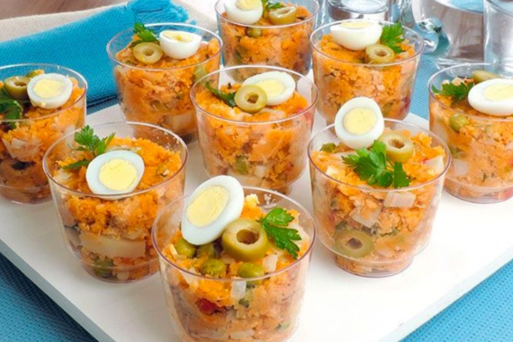 - Distribua entre copinhos individuais transparentes, decore com uma rodela de azeitona, metade de um ovo de codorna e ramos de salsa.