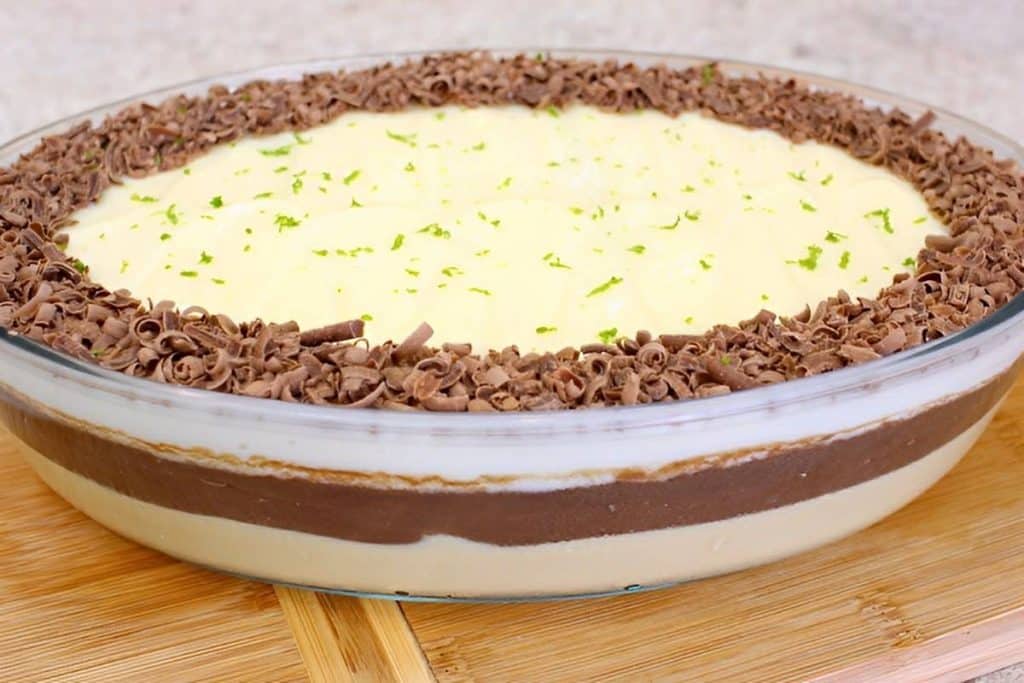 - Retire da geladeira, decore toda a superfície lateral do creme de limão com as raspas de chocolate, e polvilhe raspas de limão no centro.